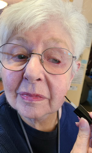 an esthetician. That experience has stuck with her and to this day she is always experimenting with different facial care products. Recently someone told her that my Fungi Stop product would take away brown spots on the skin. Naturally she wanted to experiment with it to see if it actually works. Here she is putting some on a small spot on her left cheek. We shall see if it takes the spot away. So far the last couple of days it seems to be acting like a dermal peeling agent. The area gets dry and a layer of skin peels off.