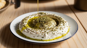 containing dried thyme, toasted sesame seeds, sumac (a tangy, lemony-tasting dried berry), and salt. The flavor profile is herby, tangy, nutty, and slightly citrusy. The classic preparation is simple: spread labneh on a plate, make a well in the center, drizzle generously with good olive oil, and sprinkle za’atar over the top. Serve it with warm pita bread for scooping. This centuries-old combination is incredibly satisfying.