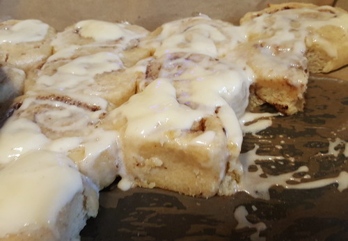 All the cut pieces were put into a 9×9 pan and put in a warm space for an hour to rise. It about doubled in size and then rose even more when baked. The final product delivered just as advertised – fluffy and gooey cinnamon rolls. The preparation was a real sticky pain in the backside to make.