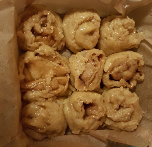 My backup recipe I found on cassidyscraveablecreations.com for gluten-free cinnamon rolls. This recipe produced a more traditional dough, however, this dough had to be refrigerated for at least 6 hours after being mixed. Here the first rise of the yeast was done during the time in the fridge. This means I made the dough before going to bed and pulled it out to make rolls in the morning. This dough rolled out nicely and rolled up into cinnamon roll shape equally easily. The cut cinnamon roll was then placed in a pan and put in a warm spot to raise. This was a much drier dough, so we got only a 50% increase in size when left to rise. After baking, the rolls looked beautiful, but it was not the light fluffy creatures the first batch made. I actually liked the flavor of the second batch better, but Ellen preferred the fluffy gooey first batch for the texture.